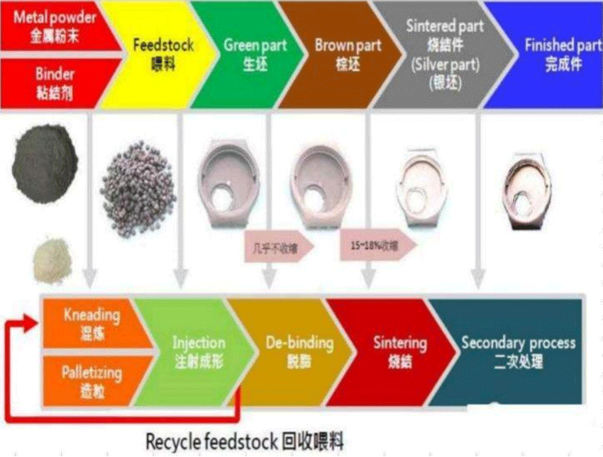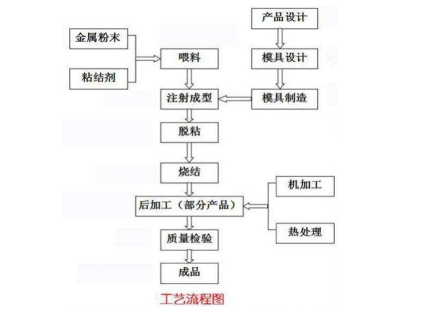 成型出零件毛坯,毛坯件经过脱除粘结剂和高温烧结后,即可 得到微观组织均匀、材料高度致密的各种金属零部件。